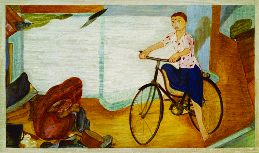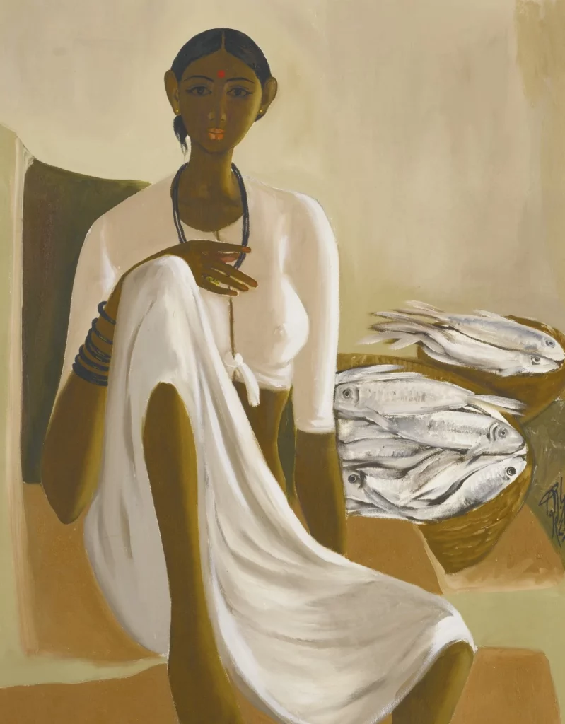 Renowned artist B Prabha worked with oil to focus on the lives of rural and tribal women living in India. These paintings depict women carrying water, working in fields, selling fish and their other daily lives. Every canvas has one dominant colour in the background, with figures repeated rhythmically across the surface.