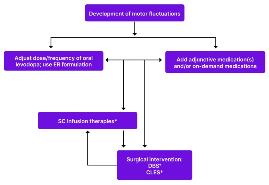 CLES: carbidopa/levodopa enteral solution; DBS: deep brain stimulation; ER: extended release; SC: subcutaneous;