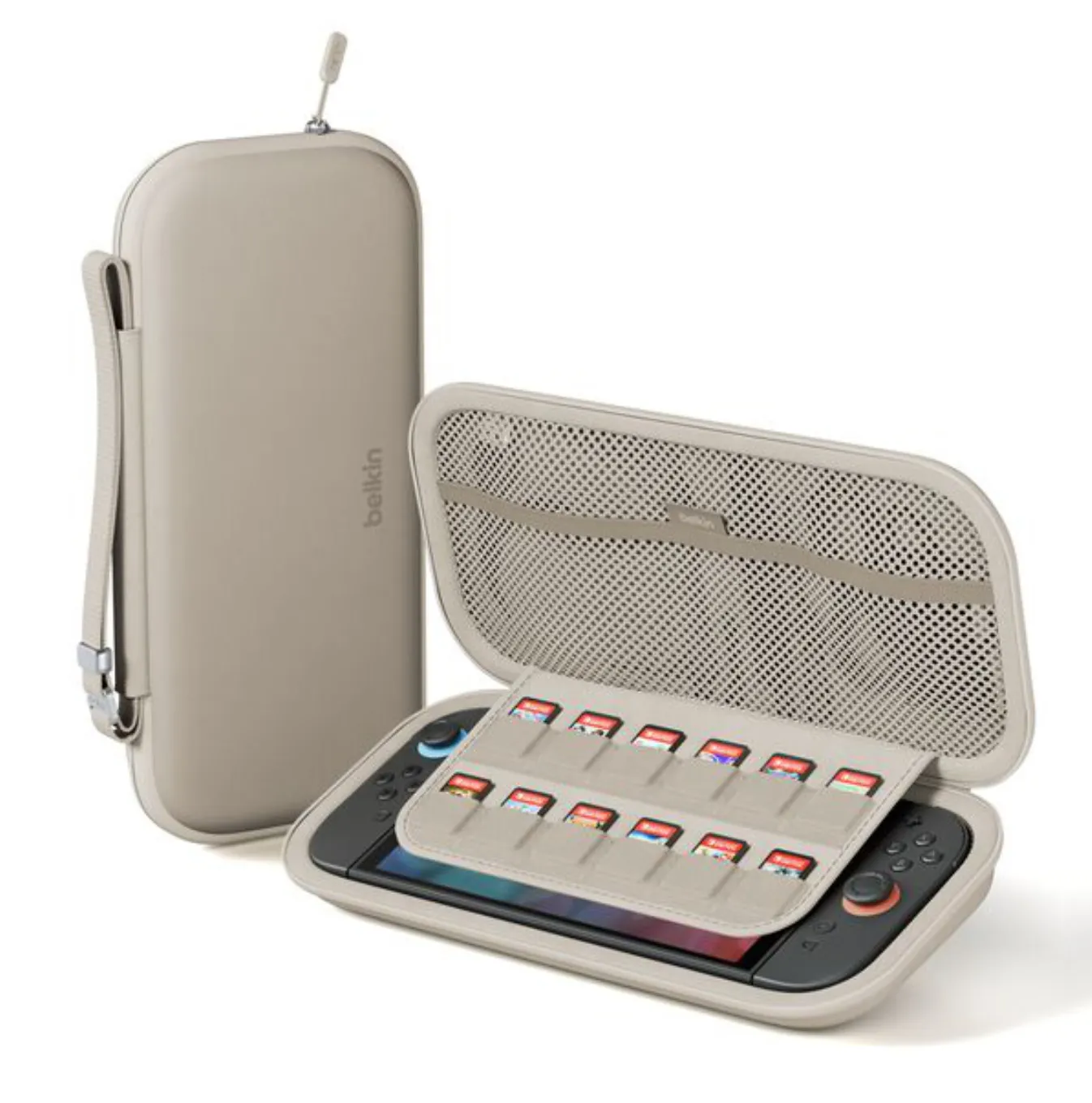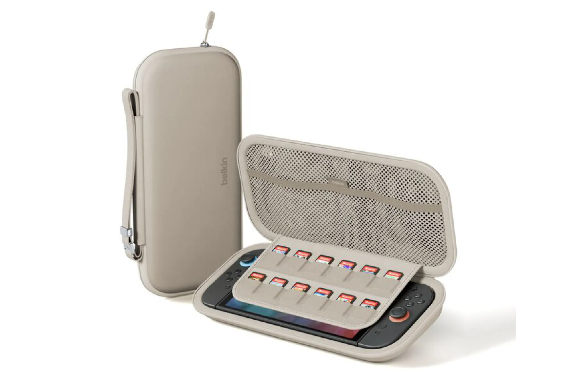 For $10 more ($29.99), Belkin’s slim case is better-looking than PowerA’s and is made with better materials. It has a carrying strap, a large mesh pocket, and a secret compartment for an Apple AirTag or similar Bluetooth tracker, all of which the PowerA case lacks. Belkin’s case can carry 12 cartridges, and it’s only slightly thicker than the PowerA case, likely to compensate for whatever cables or small gizmos you might stuff into its pocket. It features deep grooves to fit the Joy-Con 2’s triggers, and its outer shell it tough enough to prevent most accidental presses on the joysticks. It comes in dark gray, cream, and a fun green shade.