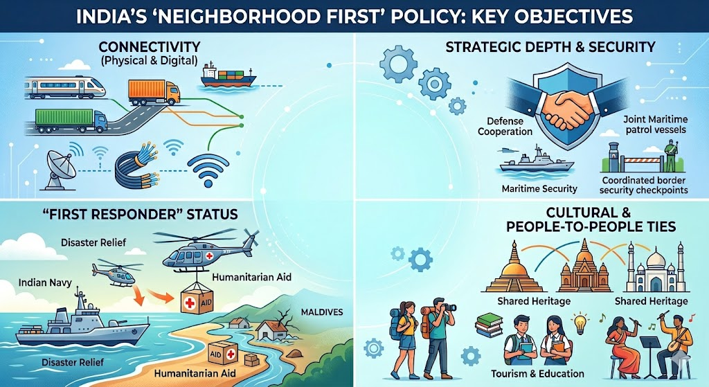 - Core Philosophy & Origins: The policy is built on the realization that India cannot achieve its global ambitions or domestic development goals without a peaceful and prosperous neighborhood.